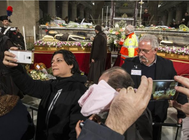 Una teca di vetro. Nella teca il cadavere di un monaco cappuccino, con il volto di cera. Sulla teca molti fiori. Davanti alla teca una donna scatta una foto con il cellulare: un selfie, per la precisione.