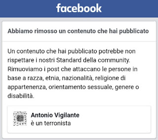 Per una singolare coincidenza, poche ore dopo il mio articolo sulla assurda censura di Marco Rovelli, Facebook mi ha notificato di aver rimosso un mio contenuto che avrebbe violato gli standard della comunità. Per quello che riesco a capire, le cose sono andate come segue. Molto tempo fa - tanto tempo, che nemmeno me ne ricordavo - ho scritto un post nel quale mi davo del “terronista”. Una uscita ironica (non particolarmente brillante, lo ammetto) che alludeva alla mia condizione di foggiano (quindi terrone) a Siena. E’ un aggettivo che uso qualche volta con i miei amici senesi, insieme al verbo terronizzare. Cose come: “Basta lavorare, lasciatevi terronizzare un po’, andiamo a prendere un caffè”. Ora, è successo che a qualcuno - che segue le mie cose con tanta attenzione da scovare un post che avevo dimenticato - quell’aggettivo non è piaciuto. Può essere che gli sia sfuggita la n, ed abbia letto terrorista, o che davvero abbia pensato che ce l’avessi con i terroni. E si è indignato tanto, da non scrivermi per chiedermi il senso di quel post (glielo avrei spiegato volentieri), ma da segnalarmi a Facebook. Come se avessi incitato a mettere i terroni sulla graticola. All’oscuro censore di Facebook è giunta questa segnalazione, e invece di farsi una risata, ha ritenuto opportuno, anzi necessario rimuovere il mio post e segnalarmelo.