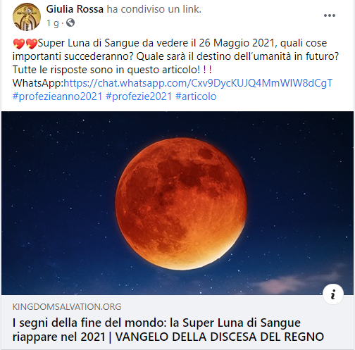 Catia Cannizzaro, Elena Rossi, Giada Clementi, Giulia Rossa e Cirilla Costa hanno due cose in comune. La prima è che sono evidentemente pie donne: assidue nel gruppo Facebook dei devoti della Madonna di Fatima. La seconda è che, a guardare il loro profilo, si scoprono volti orientali che poco o nulla hanno a che fare con i nomi italianissimi. Una ulteriore stranezza salta agli occhi se ci si sofferma a leggere i loro post. Ricorrenti sono temi escatologici, apocalittici e messianici che ormai non appartengono più da tempo alla Chiesa cattolica. E frequentissimo è il riferimento ad una luna di sangue che apparirà il 26 maggio prossimo e che ha a che fare, evidentemente, con gli accadimenti degli ultimi giorni.