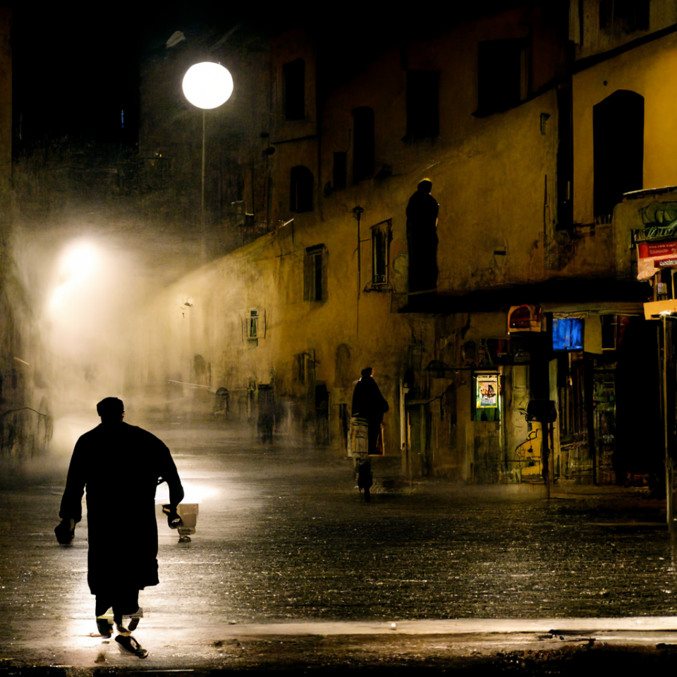 Nei miei primi tentativi con Midjoruney - occorre inserire del testo dopo /imagine - ho provato a descrivere una scena semplice. Ad esempio un uomo che cammina di notte in una qualsiasi cittĂ italiana.