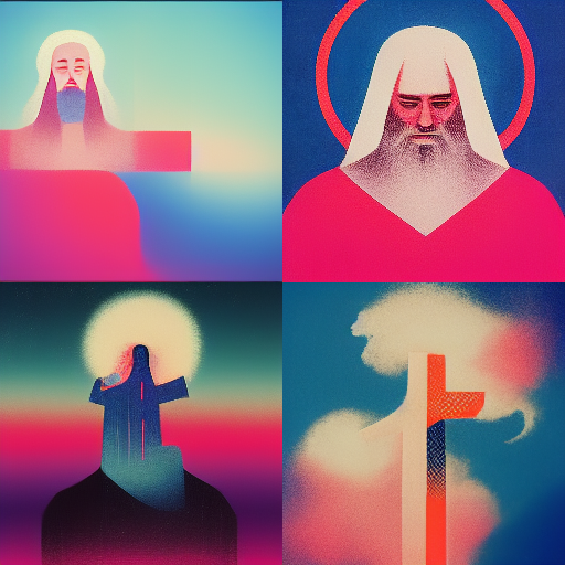 I risultati saranno tanto più originali quanto più dettagliata, precisa e complessa sarà la richiesta. Al contrario, indicazioni vaghe forniranno una rappresentazione dell’immaginario collettivo, o meglio della particolare visione che ne ha l’algoritmo. Se si inserisce ad esempio il testo “God” si ottiene l’immagine di un uomo anziano, ma spesso anche una croce. Queste quattro immagini, ad esempio, sono proposte dall’IA con la sola indicazione del soggetto, “God”, e dello stile, “risograph” (una particolare tecnica di stampa):