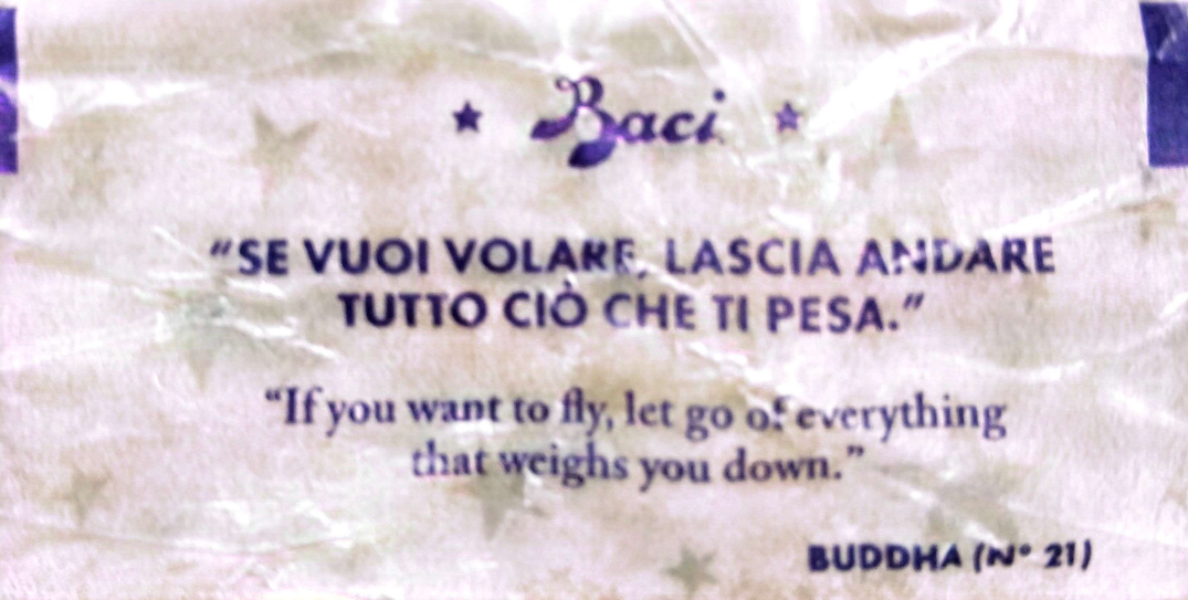 Ecco dunque il nostro biglietto: “Se vuoi volare, lascia andare tutto ciò che ti pesa”. C’è anche la versione inglese, perché è noto che il Buddha parlava in inglese, anche se con un forte accento dell’India del nord: “In you want to fly, let go of everything that weights you down”. Che è una frase che, come tutte le frasi che funzionano, vuol dire tutto e il contrario di tutto: cioè nulla.